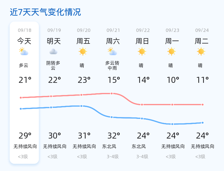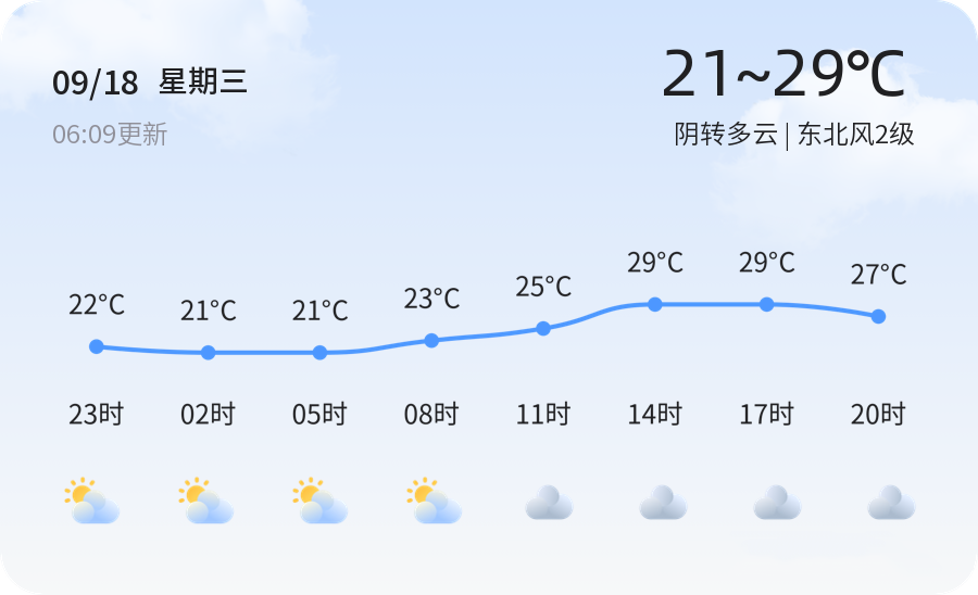 今天日期为2024年9月18日,农历八月十六,德州迎来阴转多云的天气。全市各区普遍呈现此类天气状况,清晨与傍晚时分天空稍显阴沉,但午后多云天气为主,气温适宜,最低温度21℃,最高温度达到29℃,东北风持续2级,空气湿度较高为92%,空气质量良好,PM2.5浓度为44微克/立方米。