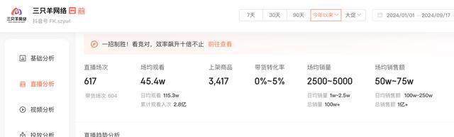 2024年至今,“三只羊网络”共直播617场,上架商品3417件,场均销售额50万至75万,日均销售额100万至250万。近90天,小杨哥抖音账号粉丝量跌去300万,三只羊网络抖音账号粉丝跌去26.5万。