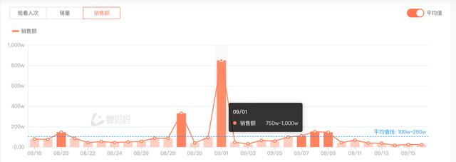 数据显示,近30天内,除17日外,“三只羊网络”每日直播,日均观看人次165.1万,日均销售额100万至250万。销售额于9月1日达到750万元至1000万元的高峰,其后逐渐走低,16日销售额10万至25万元。从数值来看,半个月骤降九成以上。