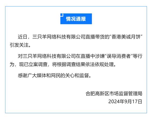 17日,安徽合肥高新区市场监督管理局发布情况通报称,“近日,三只羊网络科技有限公司直播带货的‘香港美诚月饼’引发关注。对三只羊网络科技有限公司在直播中涉嫌‘误导消费者’等行为,现已立案调查,将根据调查结果依法依规处理。”