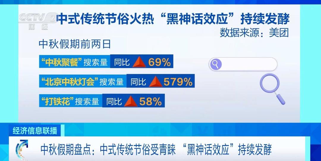 中秋节除了是出游好时机,也适合亲朋佳节聚会。数据显示,中秋假期前两日,“中秋聚餐”搜索量上涨69%,“北京中秋灯会”搜索量同比上涨579%,“打铁花”搜索量同比增长58%。