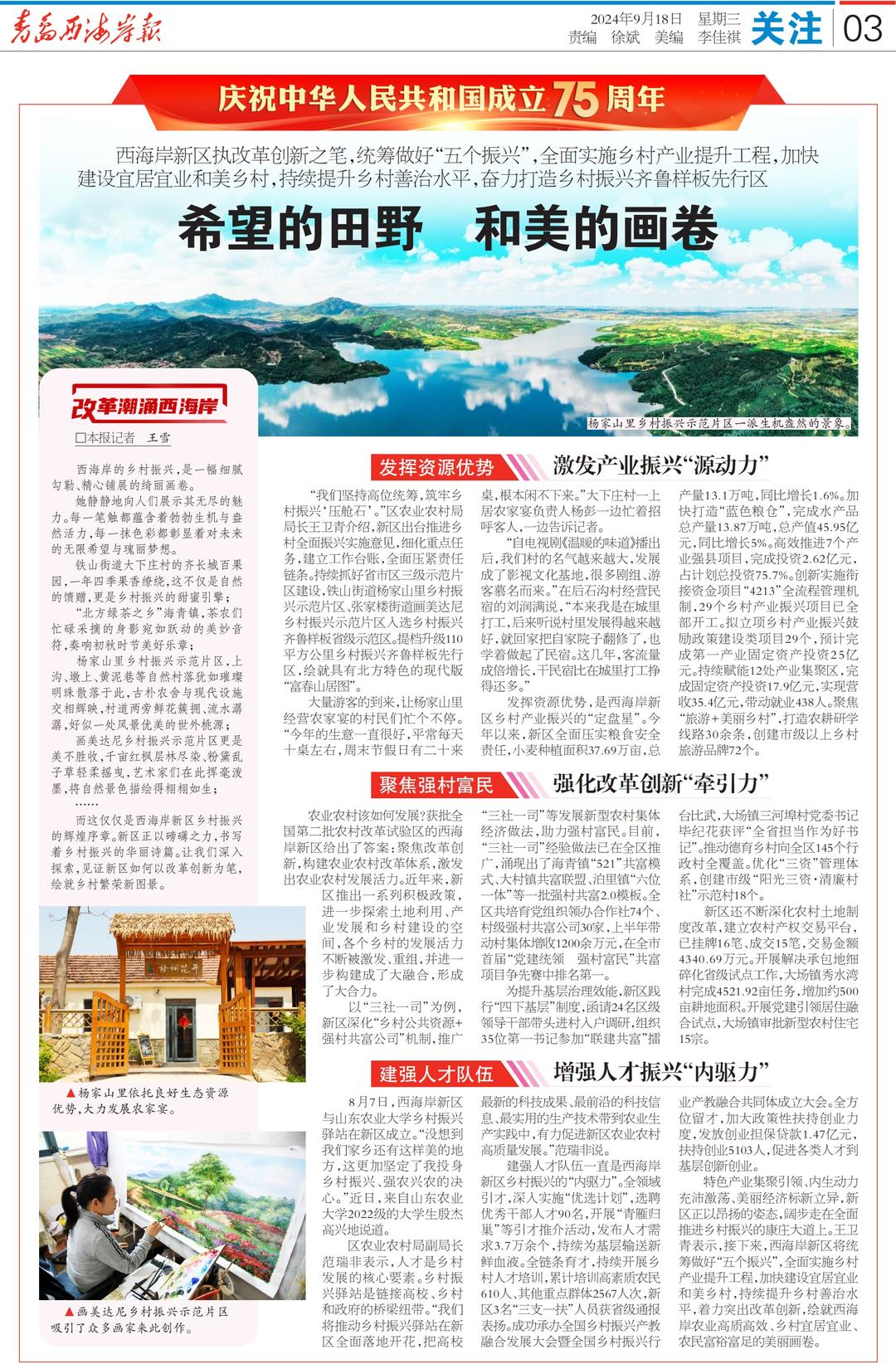 发挥资源优势,是西海岸新区乡村产业振兴的“定盘星”。今年以来,新区全面压实粮食安全责任,小麦种植面积37.69万亩,总产量13.1万吨,同比增长1.6%。加快打造“蓝色粮仓”,完成水产品总产量13.87万吨,总产值45.95亿元,同比增长5%。高效推进7个产业强县项目,完成投资2.62亿元,占计划总投资75.7%。创新实施衔接资金项目“4213”全流程管理机制,29个乡村产业振兴项目已全部开工。拟立项乡村产业振兴鼓励政策建设类项目29个,预计完成第一产业固定资产投资25亿元。持续赋能12处产业集聚区,完成固定资产投资17.9亿元,实现营收35.4亿元,带动就业438人。聚焦“旅游+美丽乡村”,打造农耕研学线路30余条,创建市级以上乡村旅游品牌72个。