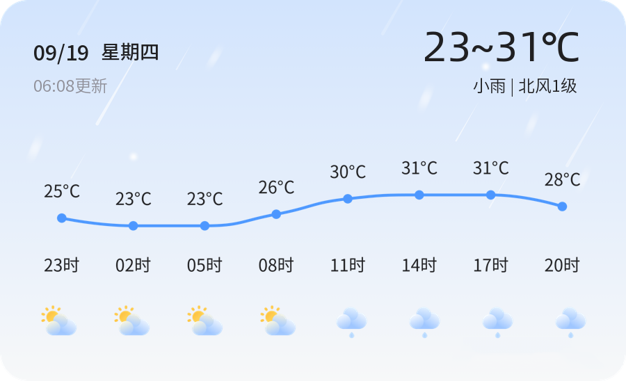 【今日天气】2024年9月19日,农历八月十七,聊城今日迎来小雨天气,气温在23℃至31℃之间波动,北风轻轻吹拂,仅1级风力。湿度高达96%,空气略显潮湿。空气质量方面,PM2.5浓度为78,属于轻度污染,市民外出时请佩戴口罩,做好防护措施。小雨天气道路湿滑,请市民朋友们出行时注意行车安全,尽量穿着防滑鞋,打伞慢行。
