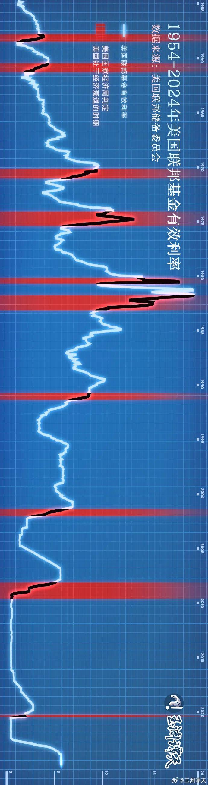 这张美国有效联邦基金利率(Effective Federal Funds Rate)的图中,红色阴影区域是美国国家经济研究局(National Bureau of Economic Research)判定美国处于经济衰退的时期。