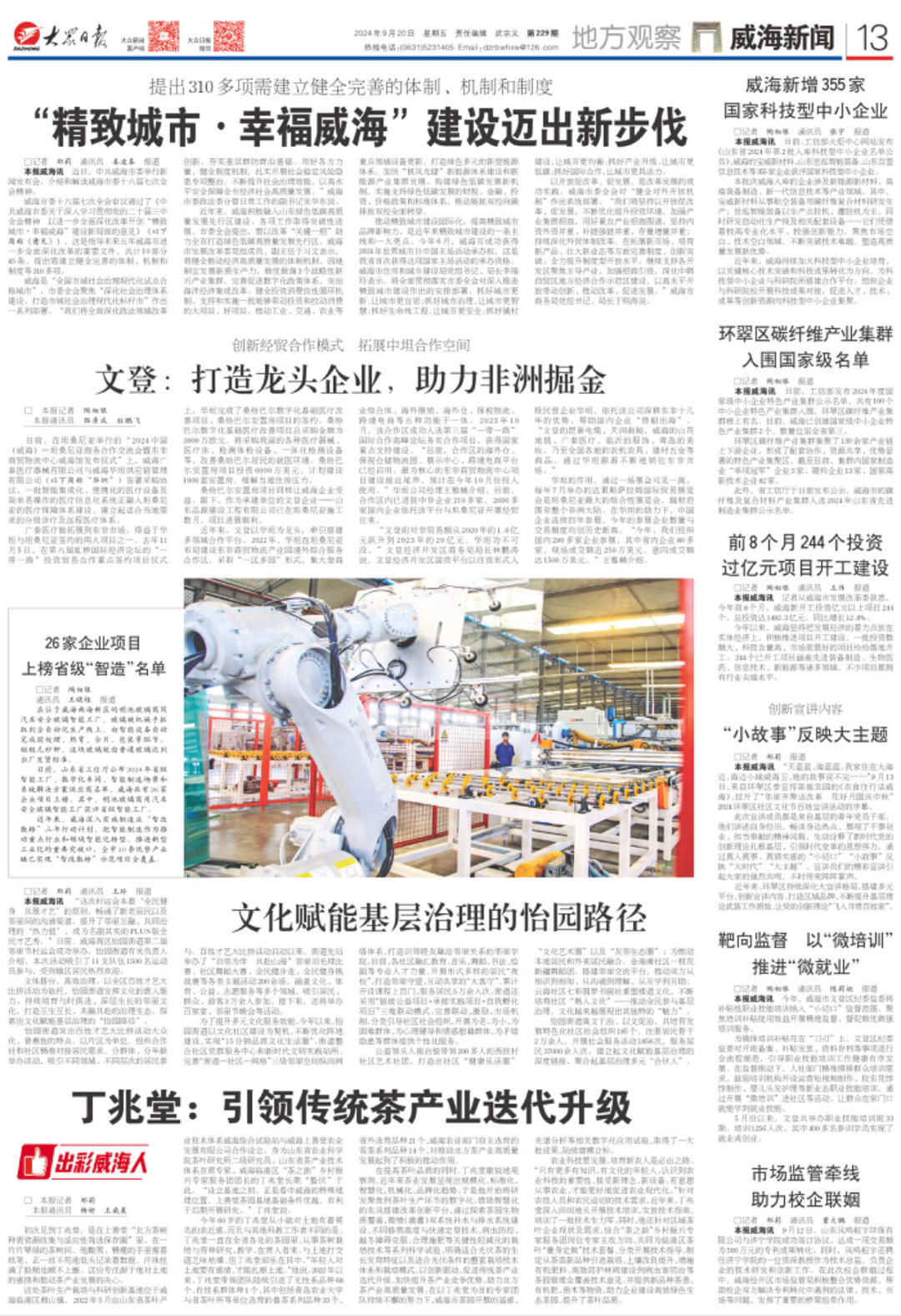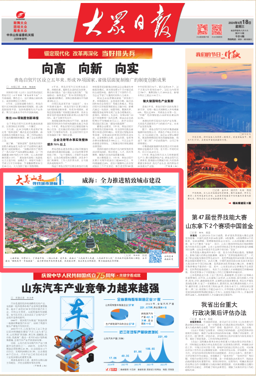 9月18日,大众日报头版的“大美山东·寻找城市地标”系列报道刊发《威海:全力推进精致城市建设》。近年来,威海全领域、全环节、全要素推进精致城市建设,奋力探索城市高质量发展新路径。人潮涌动的刘公岛、巍然耸立的环翠楼、清新脱俗的火炬八街、兼具时尚与烟火气的韩乐坊,还有兼具高颜值和深内涵的各个生态公园,呈现着这座城的精致,诠释着这座城的幸福。