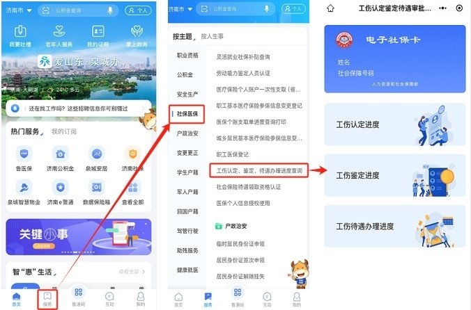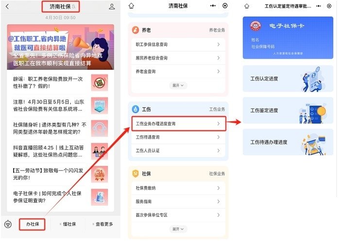 渠道一:工伤职工可以通过“济南社保”微信公众号—办社保—工伤—工伤业务办理进度查询功能实现一键查询。