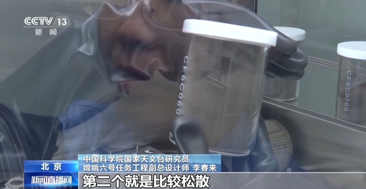 中国科学院国家天文台研究员 嫦娥六号任务地面应用系统副总指挥 刘建军:另外在挑选岩屑的过程中,嫦娥五号的岩屑明显要少一些,嫦娥六号要多一些。我们初步判断应该是嫦娥六号着陆点旁边有一个50米大小的撞击坑,所以它很有可能是因为撞击坑的溅射物被我们嫦娥六号采样回来了,这是我看到的一些物理的特性。