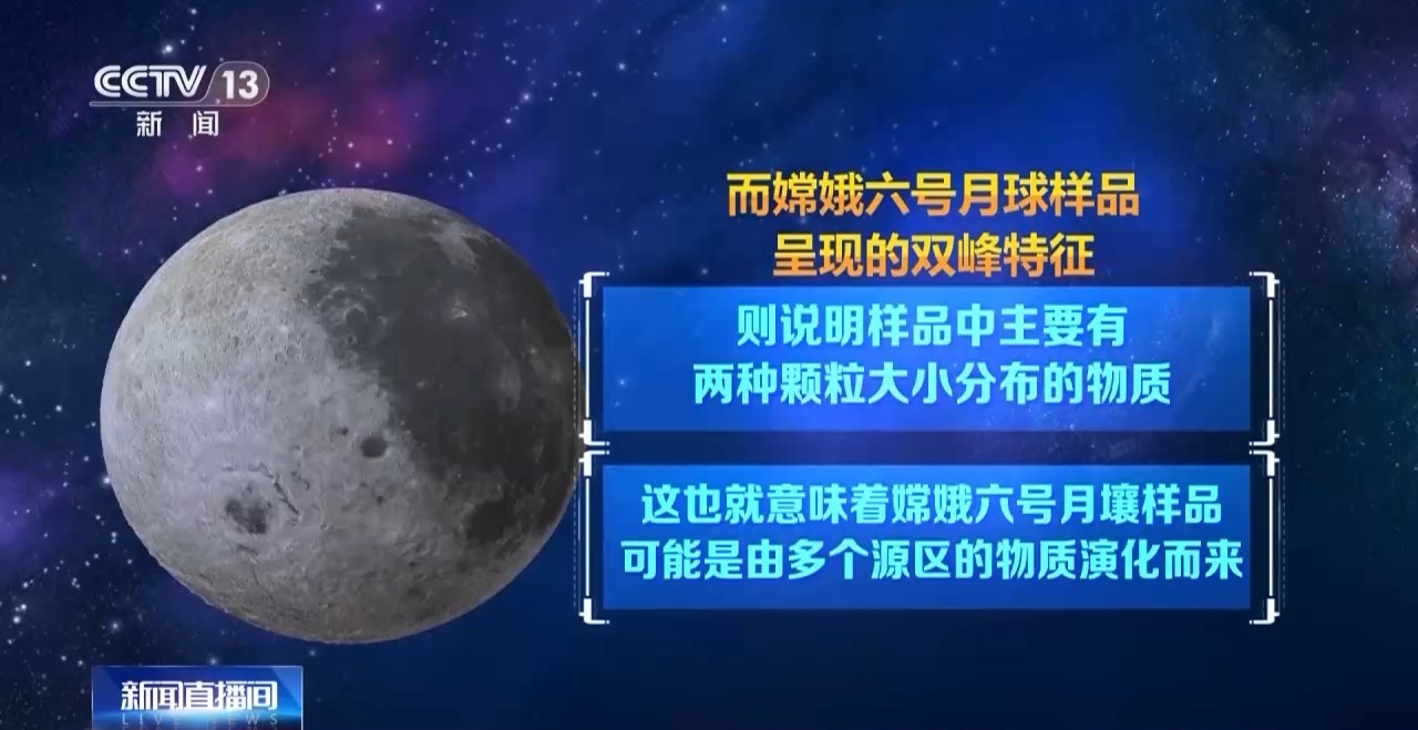 所谓颗粒的单峰特征,是指嫦娥五号月球样品基本是一种颗粒大小的物质最多;而嫦娥六号月球样品呈现的双峰特征,则说明样品中主要有两种颗粒大小分布的物质,这也就意味着嫦娥六号月壤样品可能是由多个源区的物质演化而来。