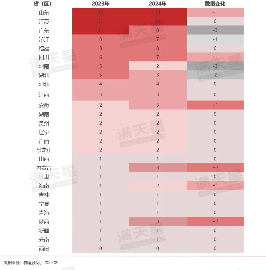 从省级行政区域分布看,山东、江苏和广东数字城市竞争力依然大幅领先,三省入围百强市数量占全国百强市数量的37%,自2021年以来持续领跑数字城市百强,并且三省2024数字省(区)得分位居前三,综合实力凸显。