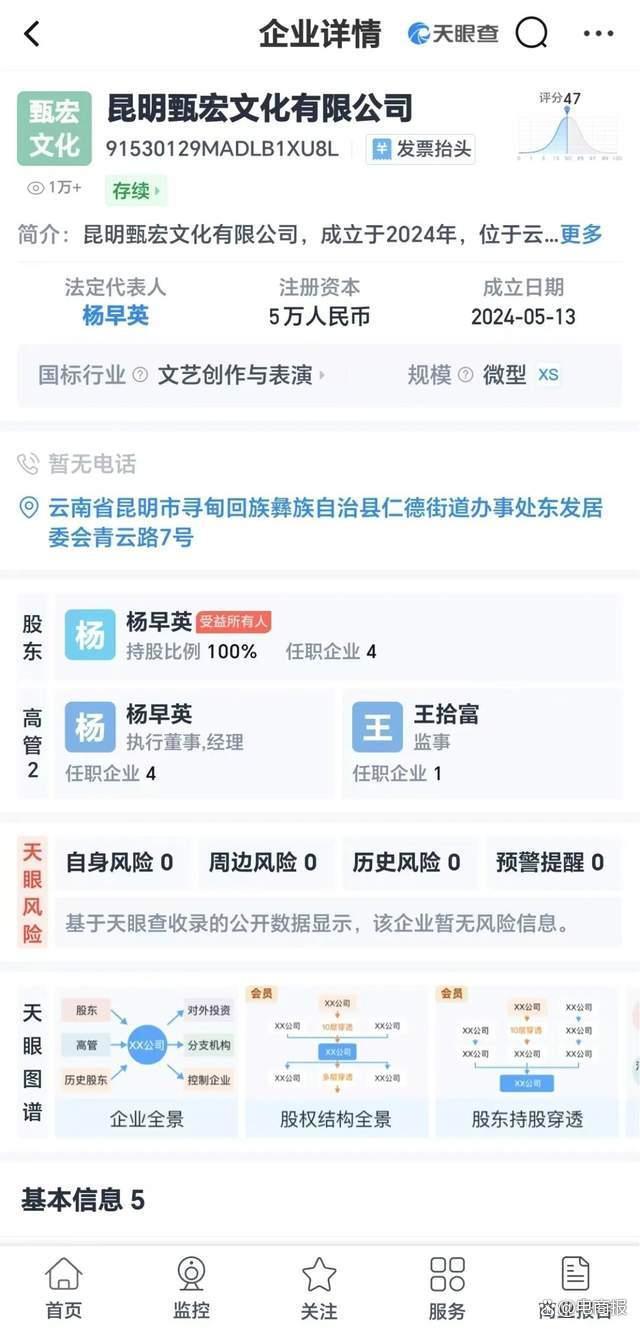昆明甄宏文化有限公司成立于今年5月,法定代表人、执行董事、经理均为杨早英,注册资本5万元人民币,经营范围包括食品互联网销售、互联网直播技术服务、文化娱乐经纪人服务等,由杨早英全资持股。