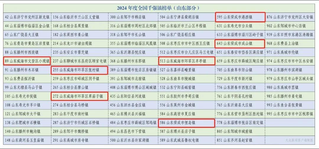 近日,中国中小城市发展指数研究课题组、国信中小城市指数研究院发布“2024年度全国综合实力千强镇”榜单,山东87个镇入选,总数居全国第4位。其中,威海7个镇榜上有名,分别为文登区小观镇,环翠区张村镇、草庙子镇、羊亭镇,荣成市俚岛镇、港西镇、成山镇。