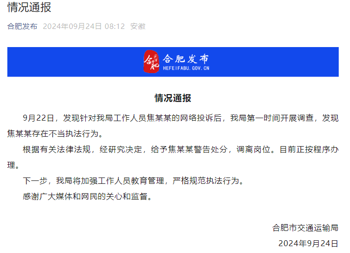 9月24日8时,合肥市交通运输局就该事件发布情况通报:接到针对我局工作人员焦某某的网络投诉后,发现焦某某存在不当执法行为,研究决定,给予焦某某警告处分,调离岗位。