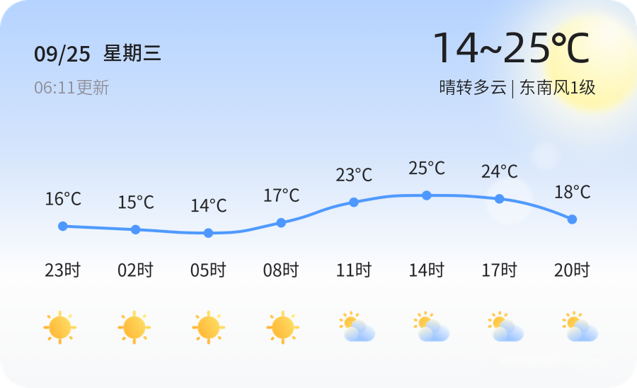 2024年9月25日,星期三,农历八月廿三,德州迎来晴转多云的天气。当前气温为13.1℃,预计白天最高温度可达25℃,夜间最低温度则为14℃。东南风1级,轻风拂面,空气质量状况良好,PM2.5浓度为70微克/立方米,对应空气质量等级为二级良,市民朋友们可放心外出。但空气湿度高达97%,需注意防潮防霉。今日天气适宜户外活动,但请随身携带雨具,以防不时之需。