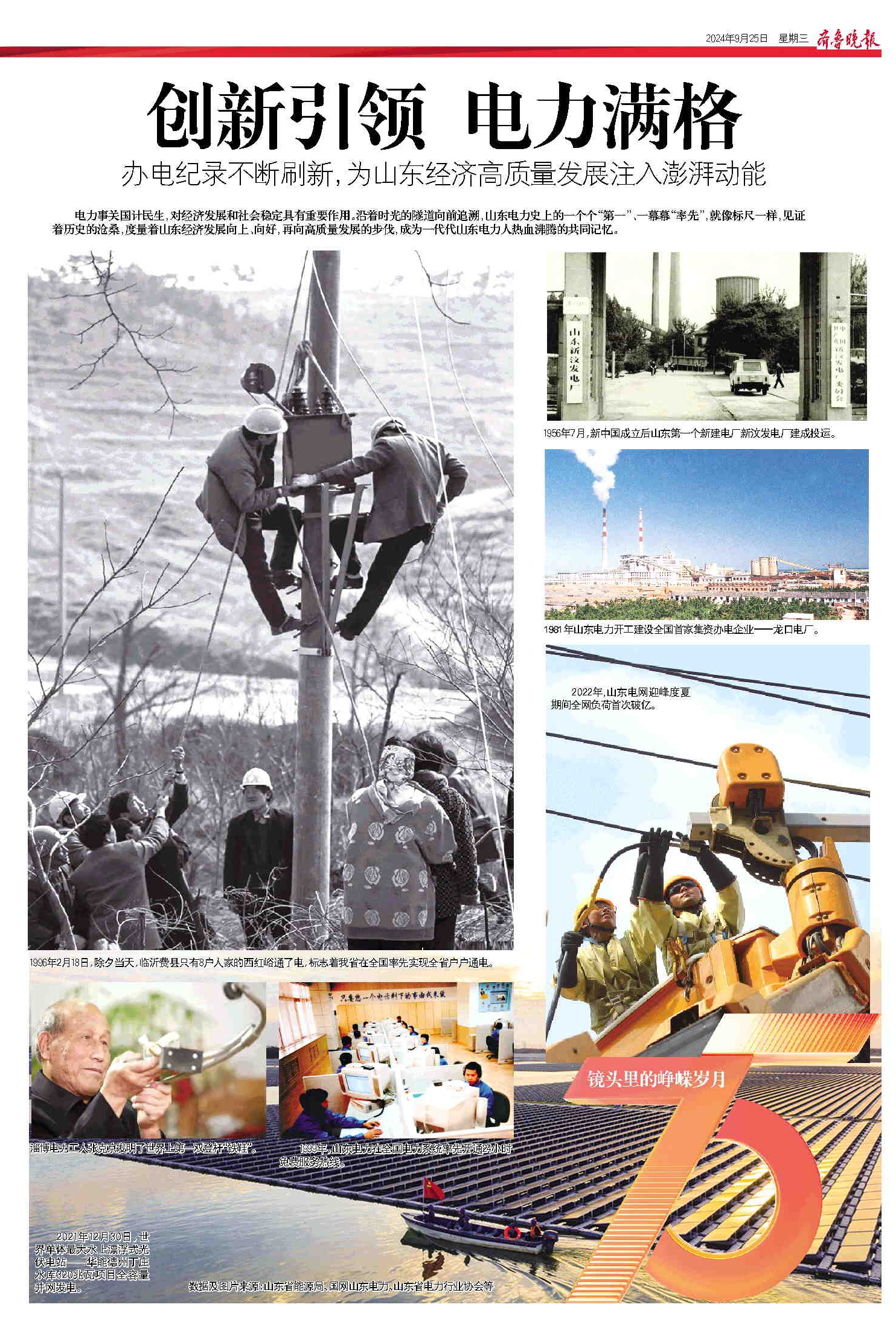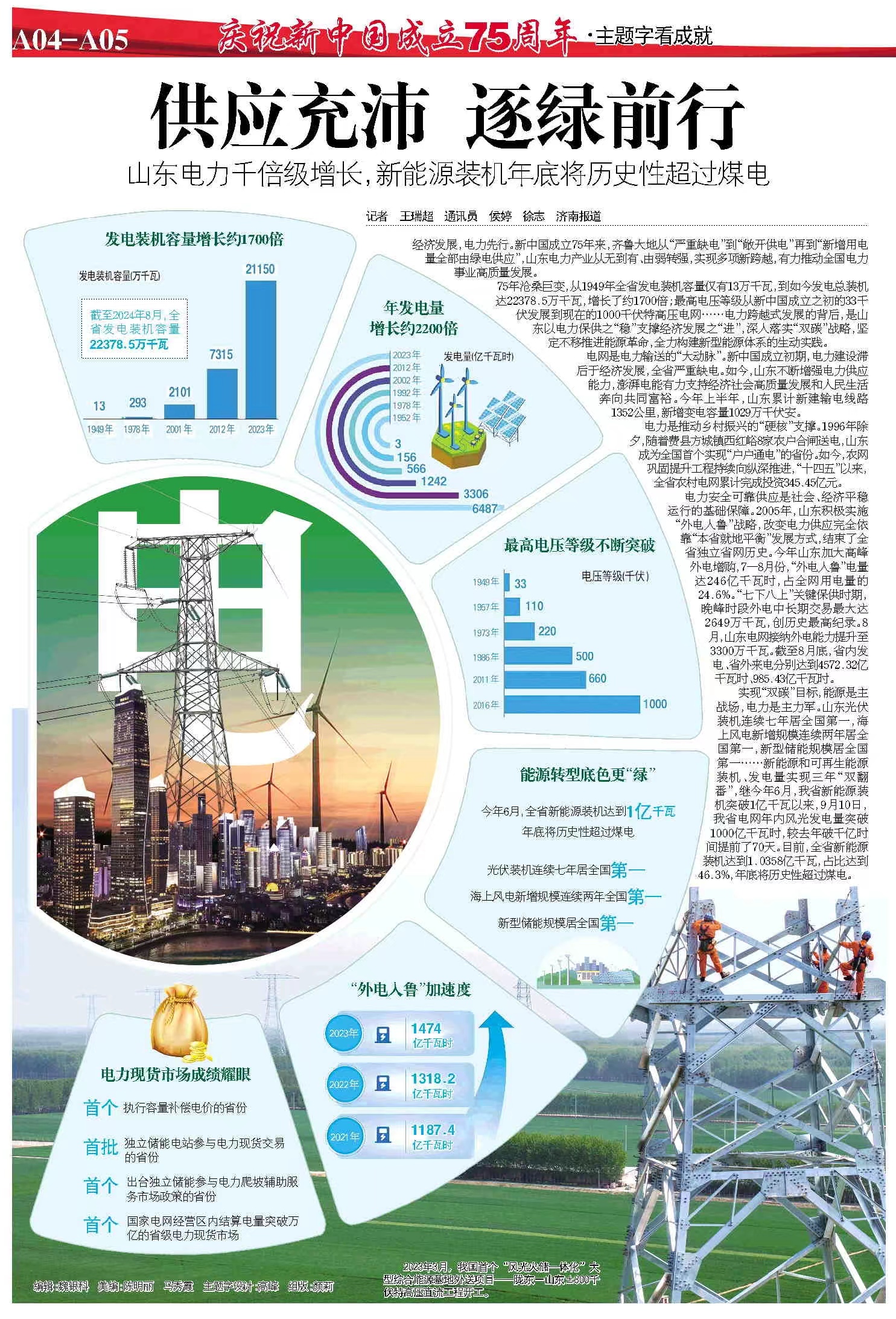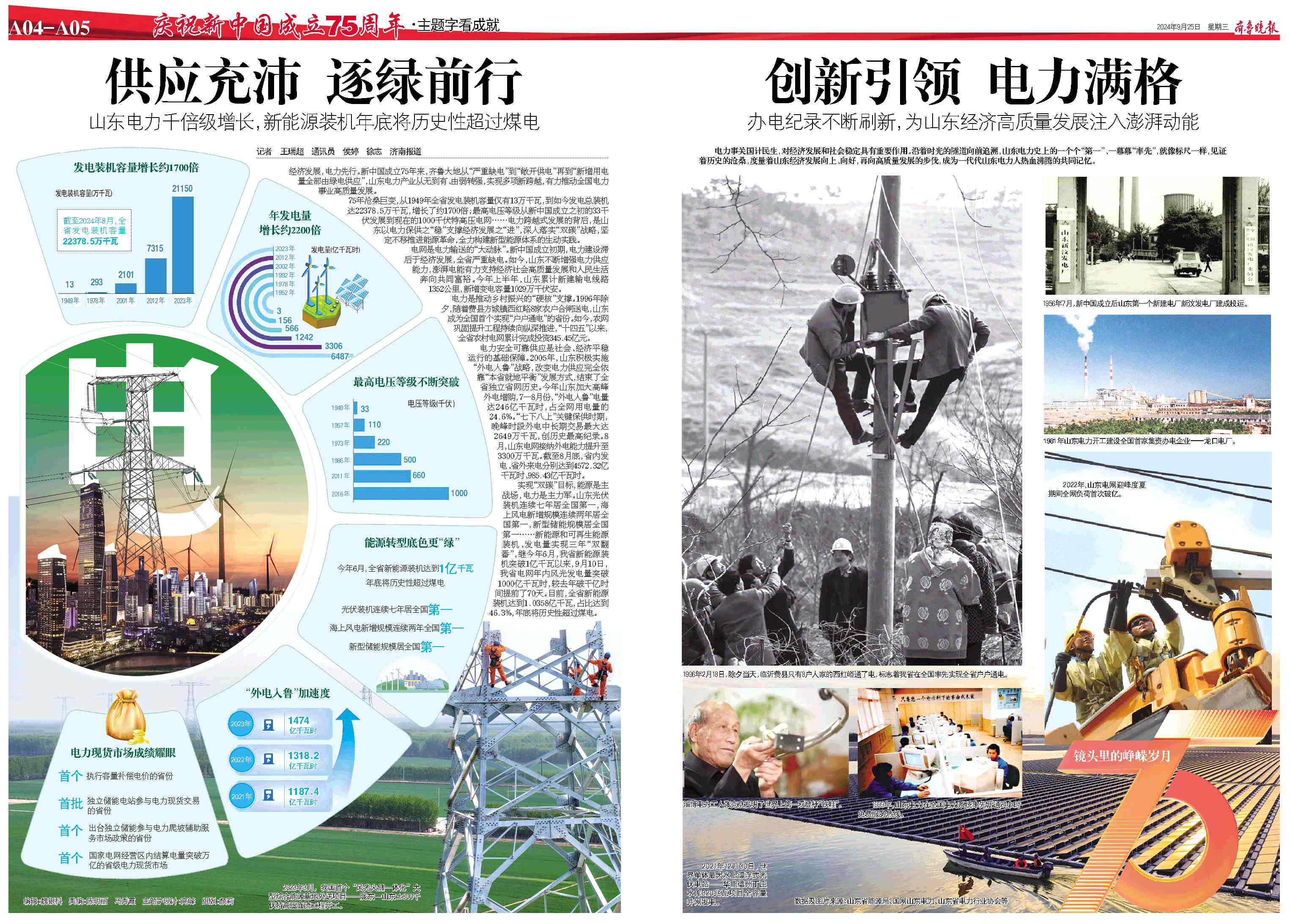 经济发展,电力先行。新中国成立75年来,齐鲁大地从“严重缺电”到“敞开供电”再到“新增用电量全部由绿电供应”,山东电力产业从无到有、由弱转强,实现多项新跨越,有力推动全国电力事业高质量发展。
