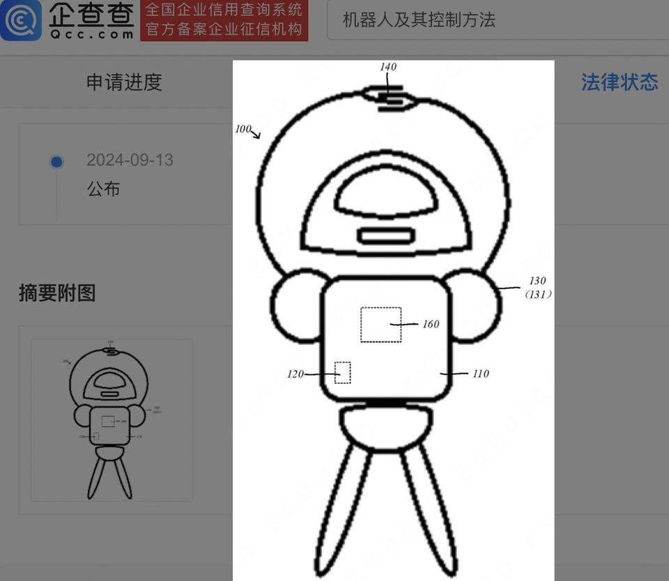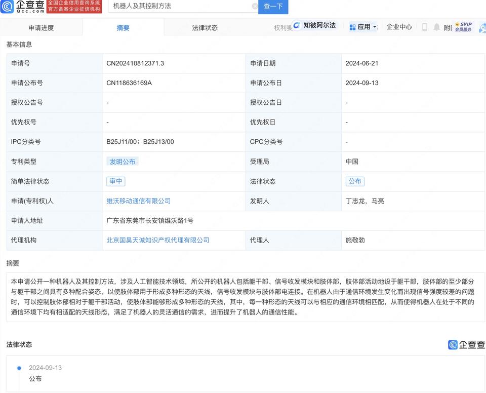 企查查APP显示,近日,维沃移动通信有限公司申请的“机器人及其控制方法”专利公布。