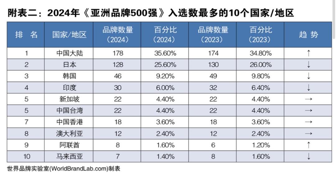 《亚洲品牌500强》(The Asia's 500 Most Influential Brands)的评判标准是品牌的亚洲影响力。基本指标包括市场占有率、品牌忠诚度和亚洲领导力。此次亚洲品牌500强排行榜,中国(包含港澳台)入选的品牌共计219个,占整个亚洲品牌500强的43.80%,位居第一,其中中国大陆入榜品牌有178个;日本有128个品牌入选,位居第二;位居第三的是韩国,入选46个品牌。