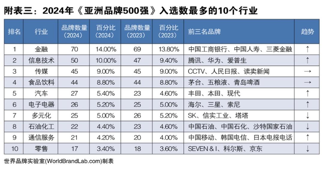 近年来,全球消费趋势和行业发展格局出现了很大的变化。与去年相比,金融、信息技术、汽车、电子电器、通信服务等行业入选数量有所上升;石油化工、建材、航空服务等行业数量则出现不同程度的下降。本年度《亚洲品牌500强》排行榜中,共有来自金融、传媒、信息技术、食品饮料、电子电器等在内的41个行业的品牌入选。金融是入选品牌最多的行业,共有70个品牌入选。位居第二到第五的行业分别是信息技术(50个)、传媒(45个)、食品饮料(44个)、汽车(27个)。其中表现出色的中国品牌有国家电网、海尔、五粮液、中国南方电网、北大荒、青岛啤酒、长虹、通威、恒力、盛虹、波司登、河钢、飞鹤、中联重科、九牧、双星轮胎、燕京、协鑫等。世界品牌实验室分析认为,与美国相比,亚洲各国的科技品牌较弱;与欧洲相比,亚洲各国的奢华品牌较弱。