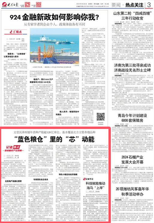 9月26日,大众日报要闻版“记者蹲点”栏目的“县域富民产业观察”系列报道,以《“蓝色粮仓”里的“芯”动能》为题,对威海市文登区泽库镇打造现代蓝色种业园区的相关工作进行报道。近年来,文登区泽库镇以科学育种技术为支撑,采用现代生产、经营和示范推广模式,全力打造现代蓝色种业园区,把传统海洋种业发展为当地特色产业、富民产业。截至2023年,园区的年苗种供应量突破120亿单位,年产值达10亿元,且基本实现了北方主要养殖品种苗种繁育的全覆盖。