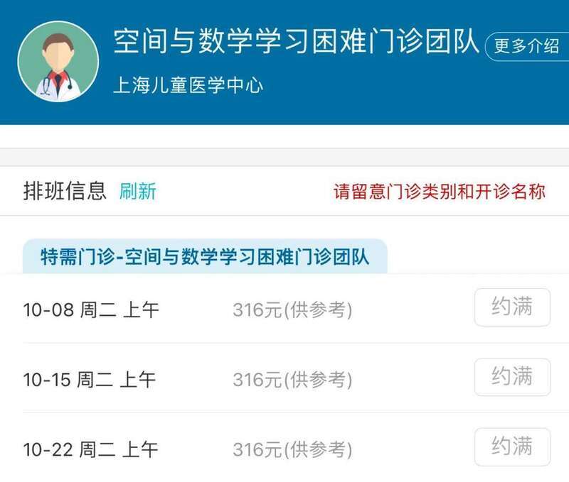 在官方预约挂号渠道查询看到,该“空间与数学学习困难门诊”系“特需门诊”,挂号费316元(供参考),目前开放预约的三天均已约满。