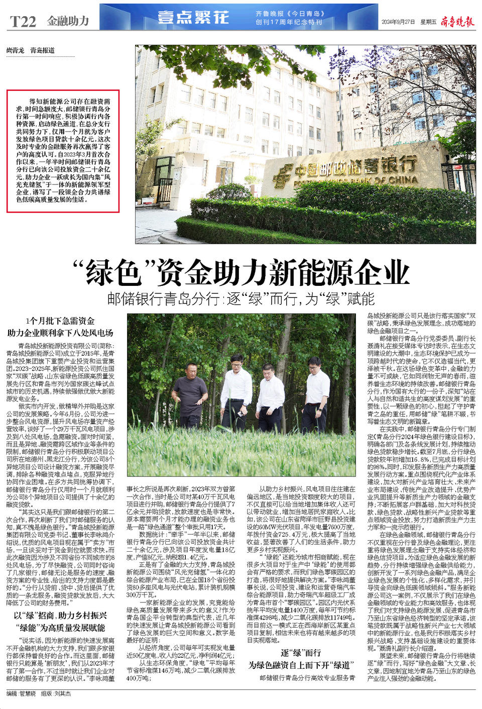 数据统计:“牵手”一年半以来,邮储银行青岛分行已向该公司投放资金共计二十余亿元,涉及项目年度发电量18亿度,产值8亿元,纳税额1.4亿元。