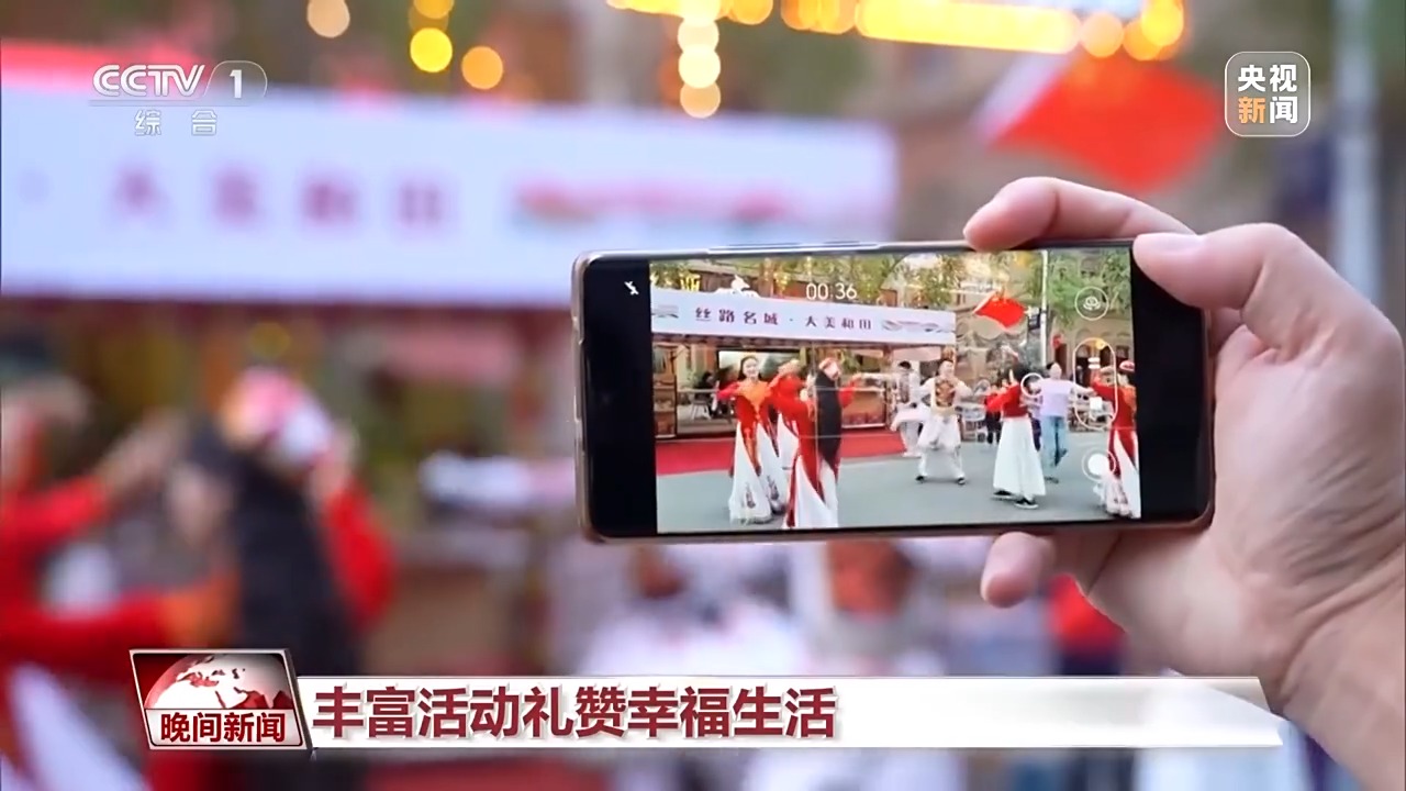 处处是喜庆祥和的节日氛围。在新疆和田,人们用热情的歌舞礼赞幸福生活。在贵州丹寨少数民族村寨,乡亲们挂起国旗,和游客共迎国庆,十分热闹。