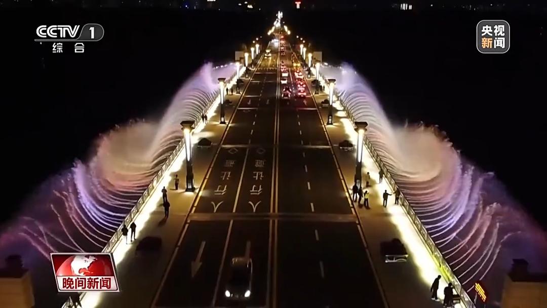在吉林长春南湖大桥,绚烂的灯光配合千变万化的喷泉,让人们沉醉其中。