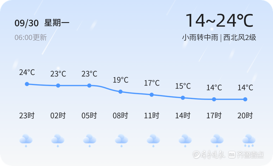 今天是2024年9月30日,农历八月廿八,济南迎来了小雨转中雨的天气,各区普遍受到雨水的影响,气温在14℃至24℃之间波动,市民出行需注意携带雨具。早晨6时,小雨淅淅沥沥地落下,西北风2级,空气湿度较高,达到75%,PM2.5浓度为44,空气质量相对较好。