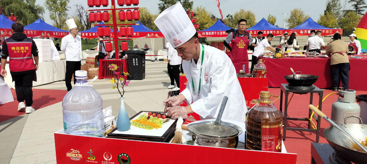 29日上午,距离黄河高青安澜百余米的高青黄河楼广场上,首届中国烹牛大赛正在举行,高青本地及全省各地的烹饪高手们,时而颠锅,时而过油、时而摆盘,一道道牛肉大餐呈现在眼前。