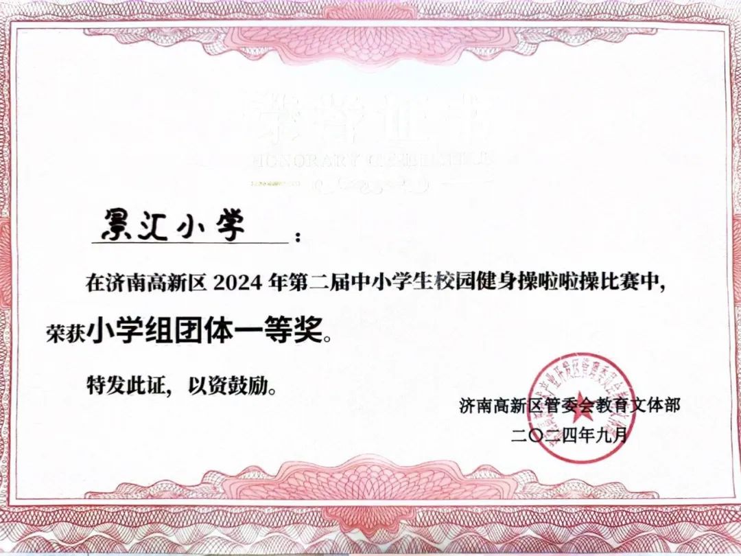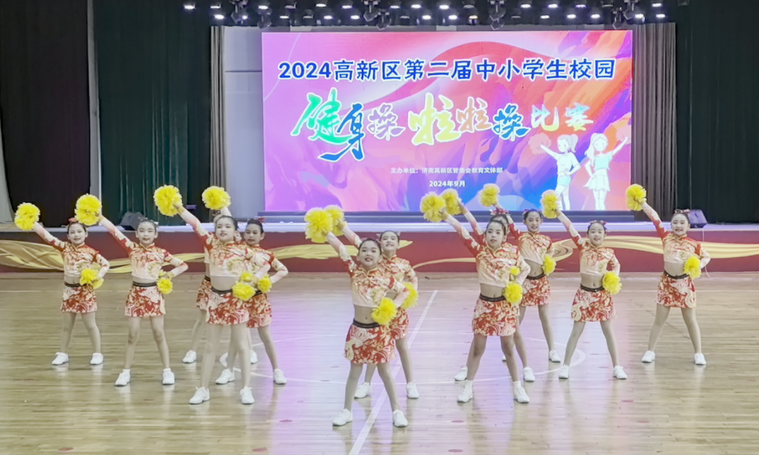 近日,济南高新区景汇小学的学生们在高新区2024年第二届中小学生校园健身操和啦啦操比赛中大放异彩,凭借其出色的团队表现,一举夺得了小学团体组一等奖。
