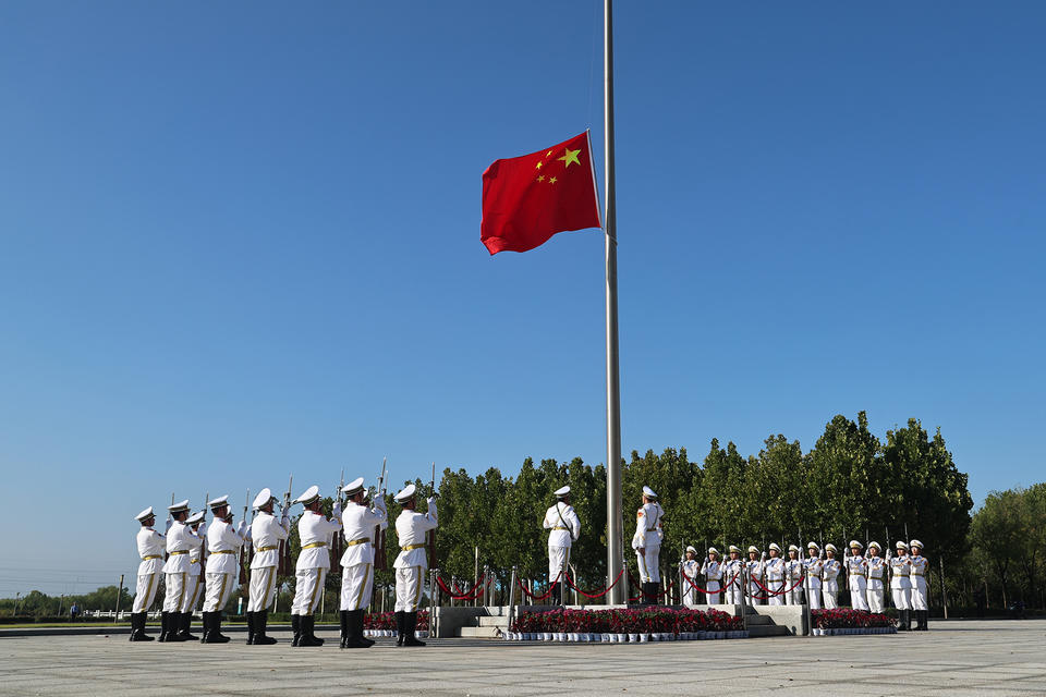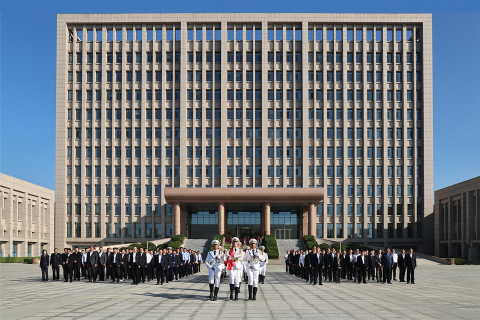 金秋十月,举国同庆。科研楼前广场上绿意盎然、鲜花绽放,参加升国旗仪式的全体人员整齐队列、庄严肃穆。伴随着庄严激昂的国歌声,国旗护卫队队员迈着矫健整齐的步伐,护卫着五星红旗走向升旗台。升旗手振臂一挥,鲜艳的五星红旗冉冉升起,全体人员肃然而立,向五星红旗行注目礼,共同表达对祖国的美好祝福。(大众新闻·黄三角早报记者 赵军)