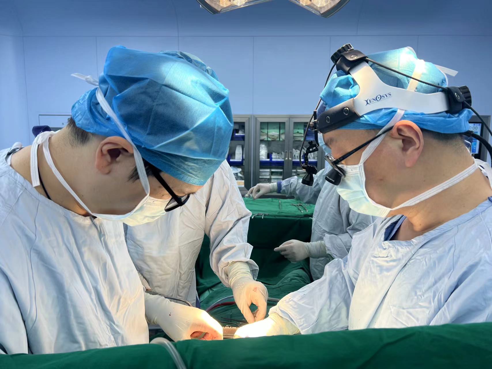 麻醉手术科夏斌主任医师为患者实施单次腰麻后,张刚主任医师团队迅速游离出股动静脉,为体外循环插管做好准备。
