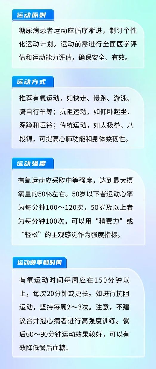 糖尿病患者在运动时应穿着适合的运动鞋和服装,选择合适的运动环境,运动前后各进行5分钟的热身和放松活动,运动后注意补充水分。有严重并发症的糖尿病患者,如心功能不全、严重糖尿病肾病或视网膜病变等的患者,应谨慎选择运动方式和运动强度。