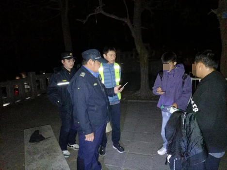 10月2日夜间,泰山景区黑虎峪工队报告发现多名经非游览路线登山游客,景区执法局红门执法大队接到通知后立即前往现场进行调查。