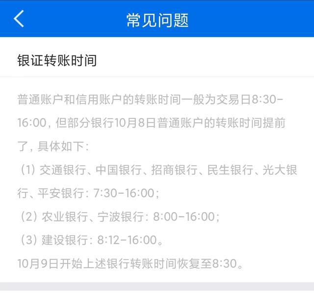 华泰证券华泰证券也通知称,公司已与部分银行联系并确认10月8日普通三方转账时间可临时提前:交通银行、中国银行、招商银行、民生银行、光大银行、平安银行由原来的8:30提前至7:30;农业银行、宁波银行由原来的8:30提前至8:00;建设银行由原来的8:30提前至8:12。10月9日开始,上述银行转账时间恢复至8:30。