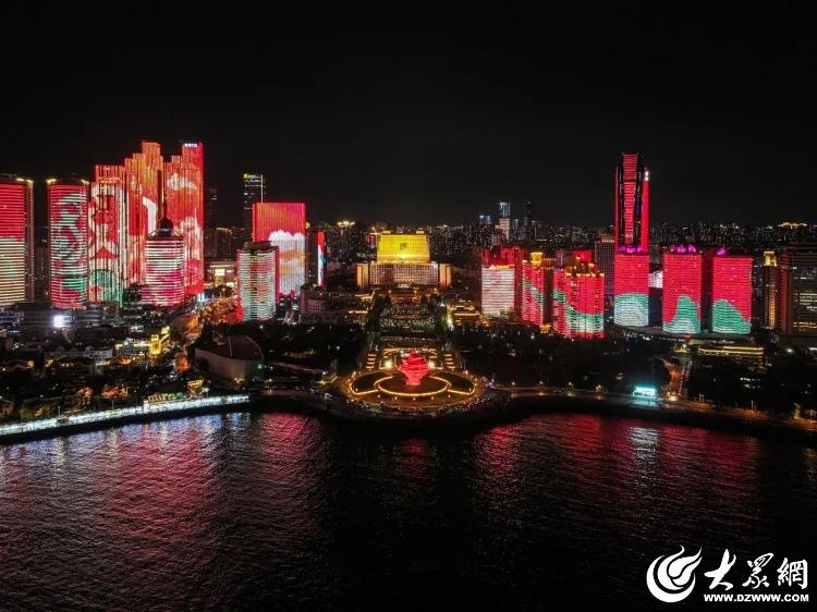 市南区国庆假期期间,浮山湾每天举办点亮国庆主题灯光秀,以海为台,以天为幕,以城为景,通过恢宏大气的光影,展现75年间高质量发展的中国风采,庆祝中华人民共和国成立75周年。夜晚浮山湾沿线楼宇化身“夜青岛”的恢宏画布,以灯光串起璀璨夜色,“热烈庆祝中华人民共和国成立75周年”的大字徐徐铺开,气势宏大、光彩夺目,营造出喜迎国庆的欢乐祥和氛围。