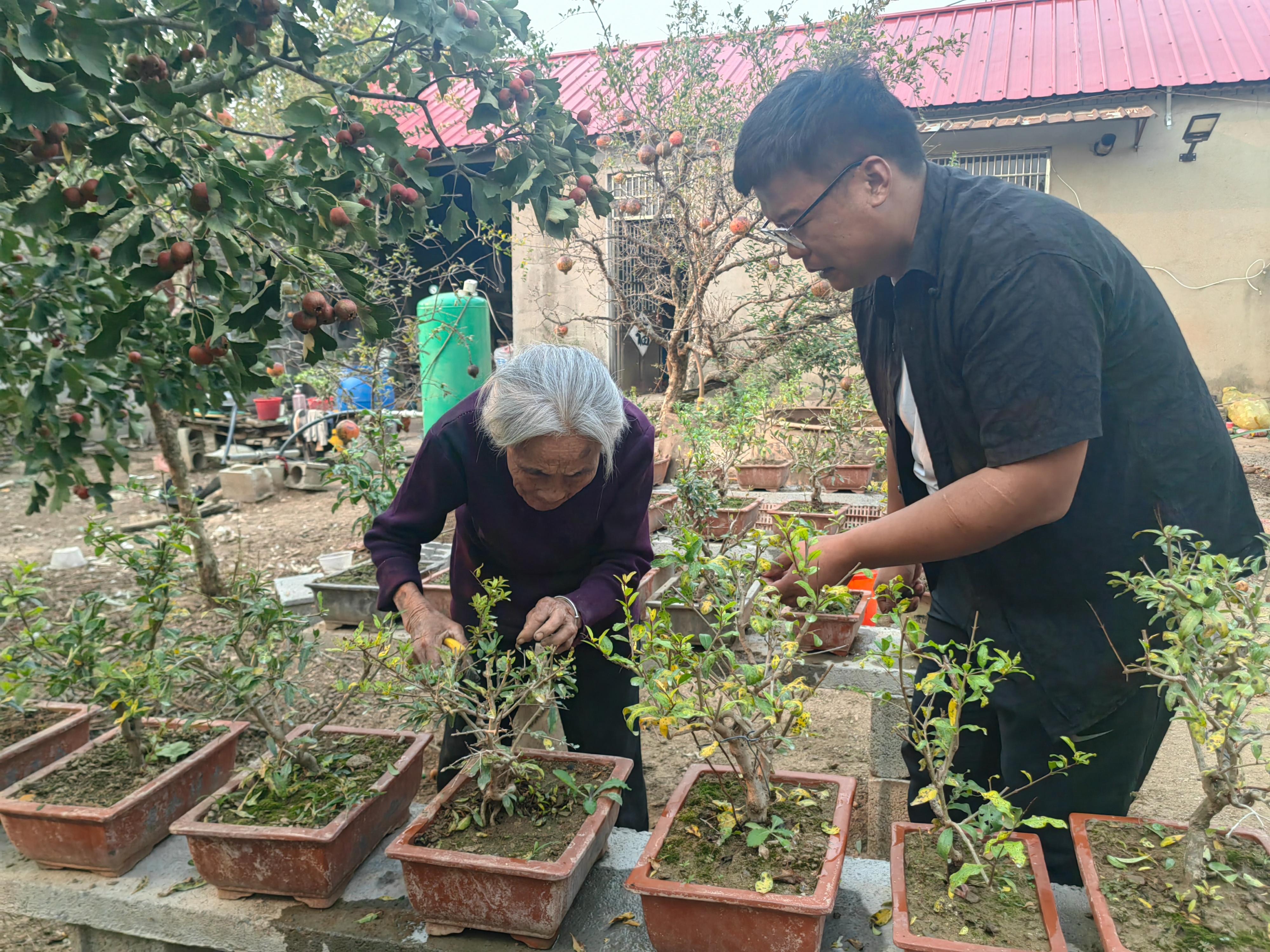 啥是“盆景养老”呢?刘威解释,依托冠世榴园特有的石榴种植、盆景制作和专业人才等资源优势,让村里60岁以上老年人在家养护童子功盆景,根据盆景品相每盆给予农户50—100元不等的养护费用,让这些老人足不出户,干些力所能及的活儿,就能挣钱养老。