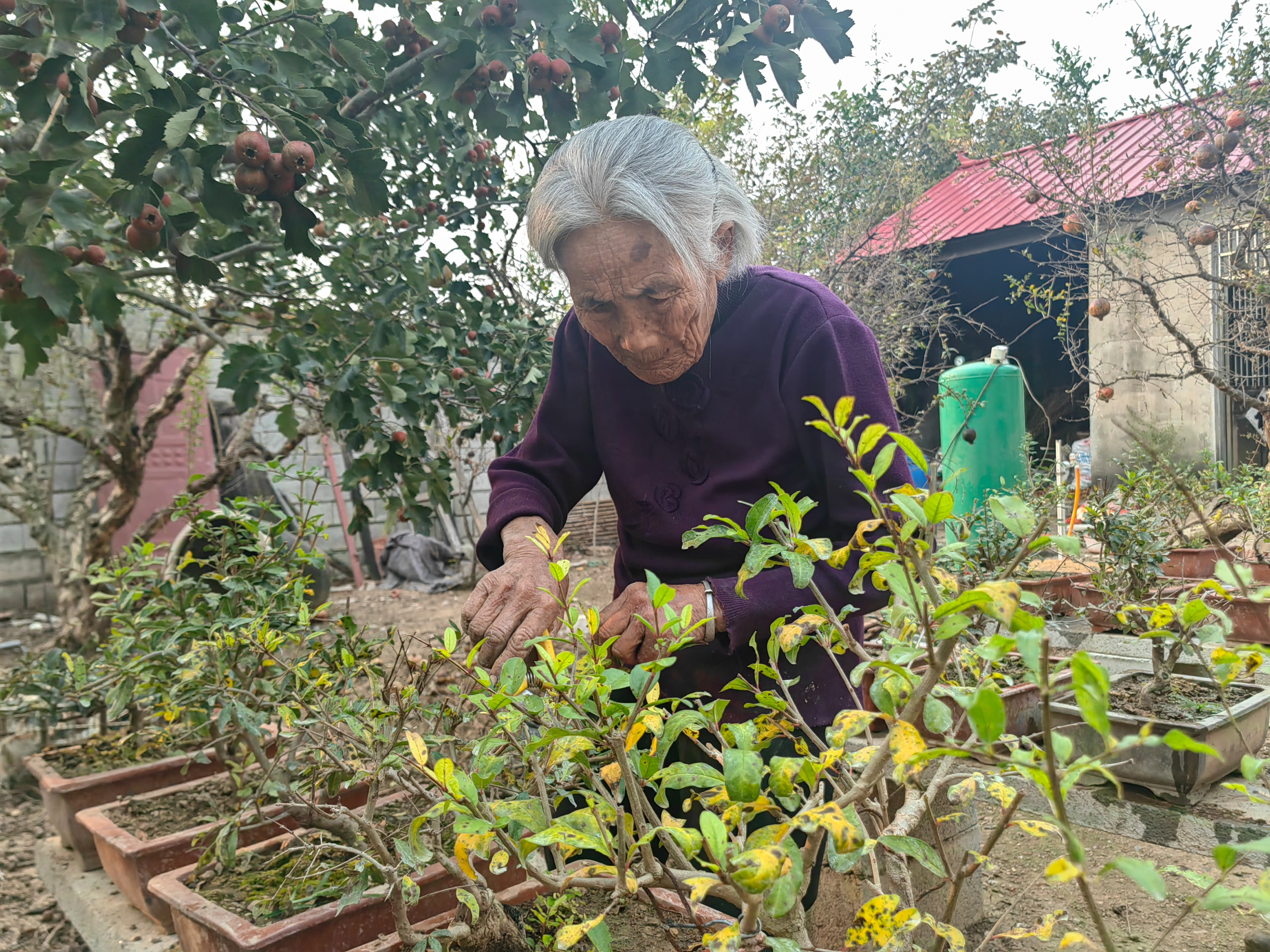 夕阳西下,一排排姿态各异的盆景在阳光的映射下,婀娜多姿。“平时就是给这些盆景浇浇水、剪剪枝,养这50盆累不着……”细数起盆景养护,90岁的孙张氏像呵护宝贝一样,精心地养护着这些石榴盆景。