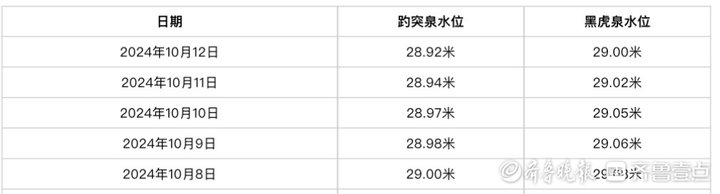 根据济南市城乡水务局官网发布的数据,10月12日7时,趵突泉地下水位降至28.92米,黑虎泉地下水位也来到29.00米。两大名泉水位均较前一日下降2厘米。