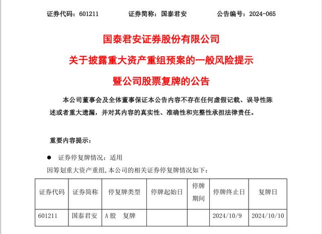国泰君安公告复牌
