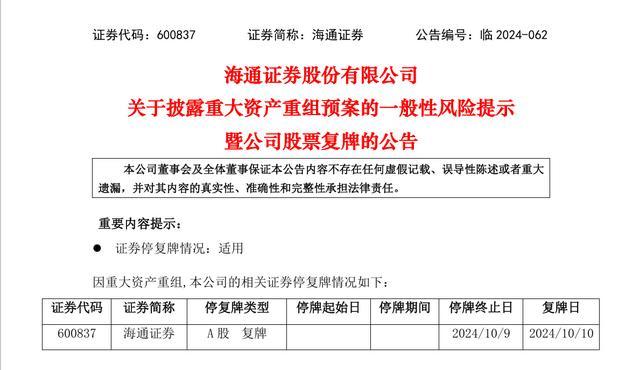 经向上交所申请,两家公司A股股票将于2024年10月10日(星期四)开市起复牌。