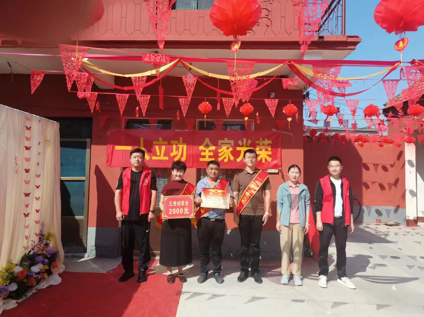 婚礼现场,镇退役军人服务站悬挂“一人立功、全家光荣”条幅,为杨凯及家人佩戴大红绶带,同时送达立功喜报和三等功奖金,向两位新人送上真挚的新婚祝福。