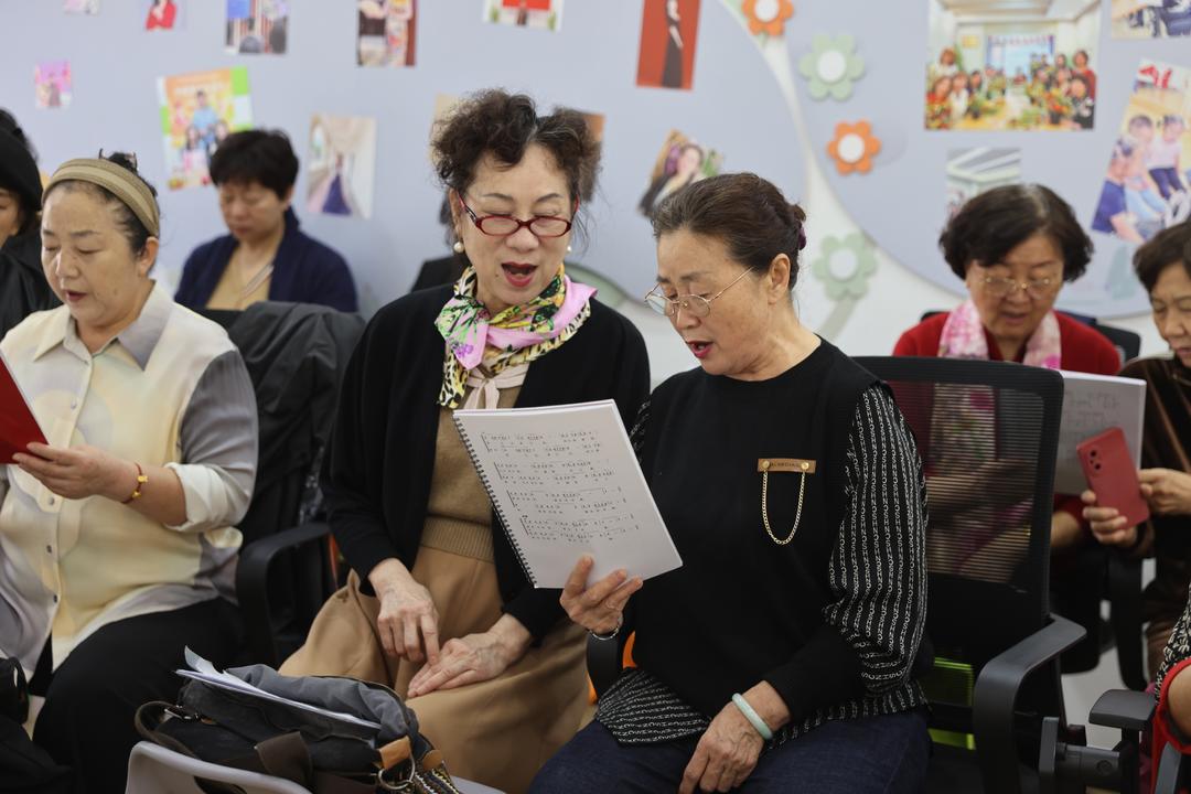 就在杨仲春挥毫泼墨时,一旁的文体活动室里,70岁的张新芳正和合唱团的老人们一起练声、排练曲目。