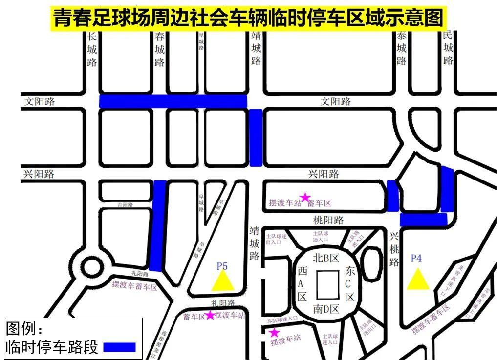 比赛结束后,在春城路(礼阳路到文阳路段)、靖城路(兴阳路到文阳路段)、民城路(桃阳路到文阳路段)设置出租车、网约车临时停靠区域,请球迷朋友到指定区域乘车。