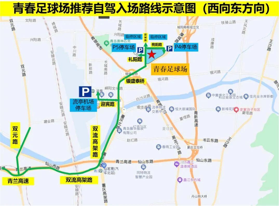 3. 流亭机场停车场:位于峄阳文化路新郑路路口西南角,车位约800个,供观赛球迷车辆停放,现场开通自流亭机场停车场至足球场的摆渡车。