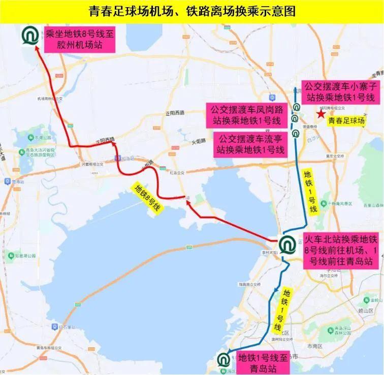 2. 去往铁路青岛站的球迷,在地铁1号线小寨子、凤岗路、流亭地铁站乘坐往王家港方向列车至青岛站下车。