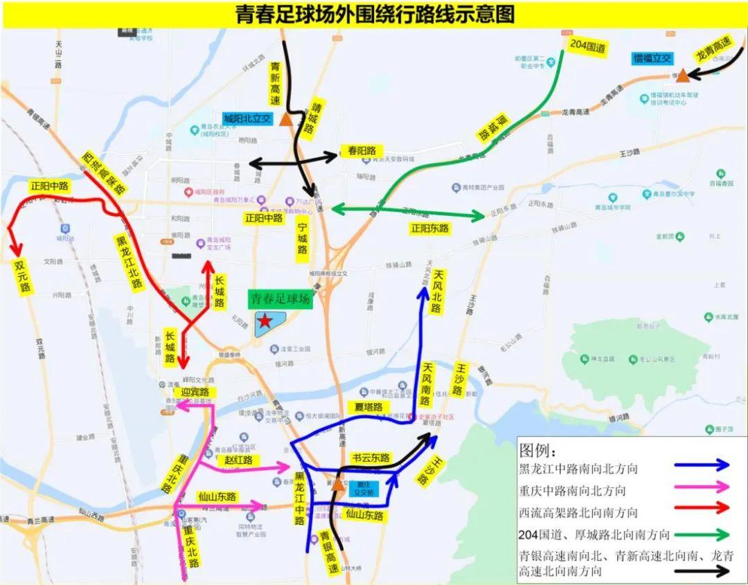 赛事举办期间足球场周边部分道路将分时、分段采取临时交通管制措施,区域交通影响较为明显,请途经车辆提前选择绕行。