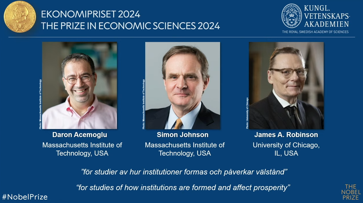 2024年“诺奖周”已进入尾声。北京时间10月14日,2024年诺贝尔经济学奖公布,Daron Acemoglu,Simon Johnson和James A. Robinson获奖。