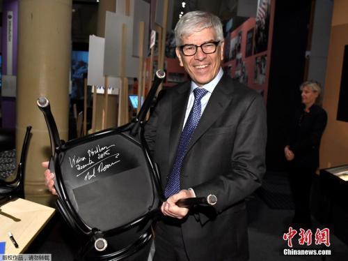 资料图:2018年诺贝尔经济学奖获得者保罗·罗默展示其签名的椅子。