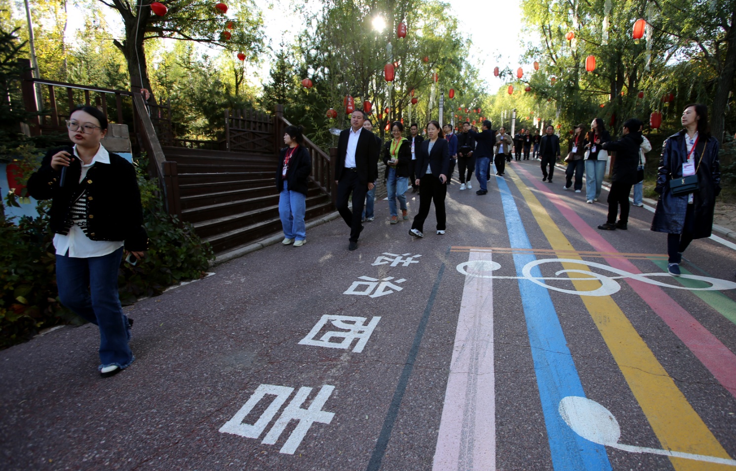 图为采访团记者在龙王坝法治彩虹路上观摩采访。