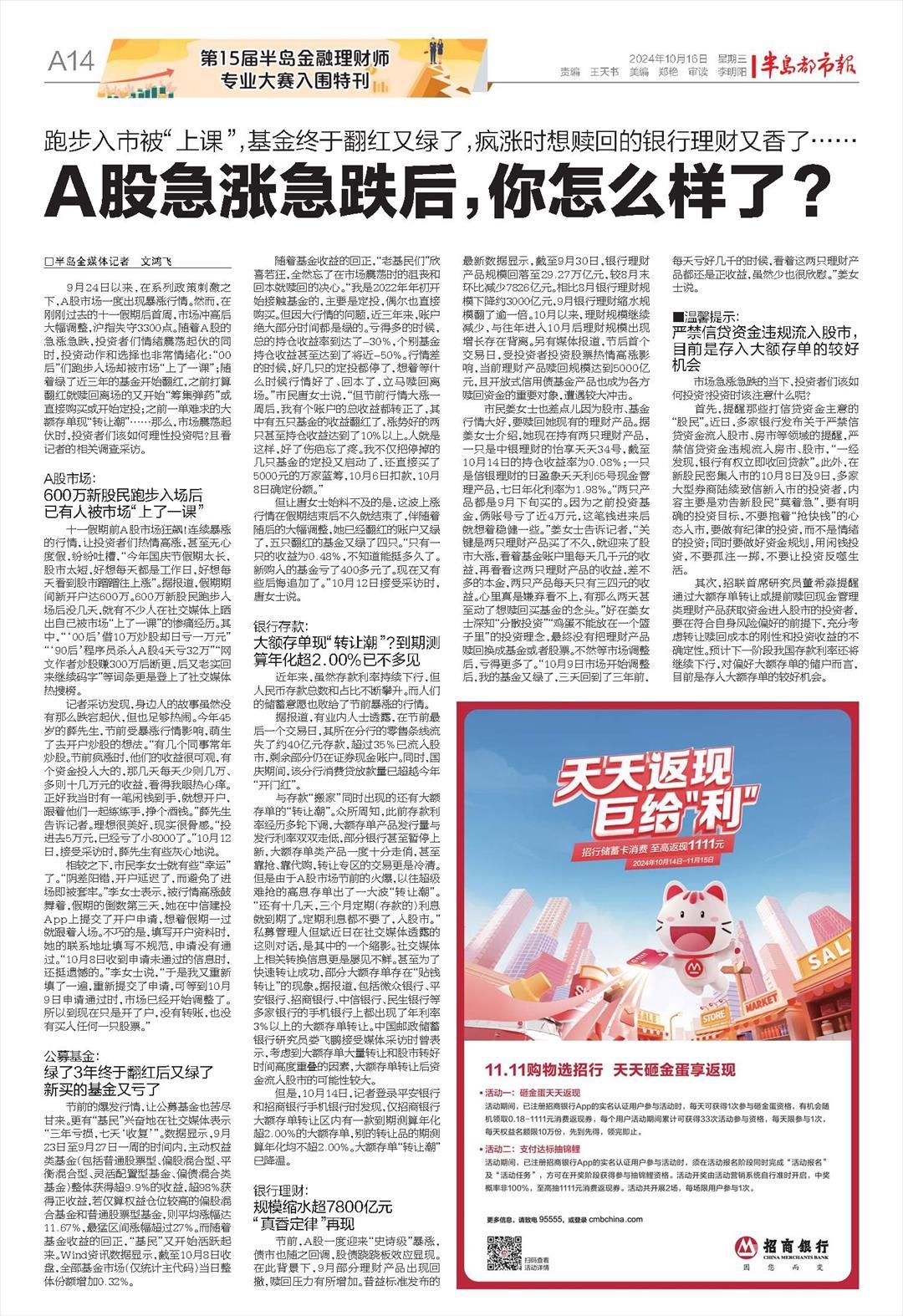 A股急涨急跌后,你怎么样了?跑步入市被“上课”,基金终于翻红又绿了,疯涨时想赎回的银行理财又香了……